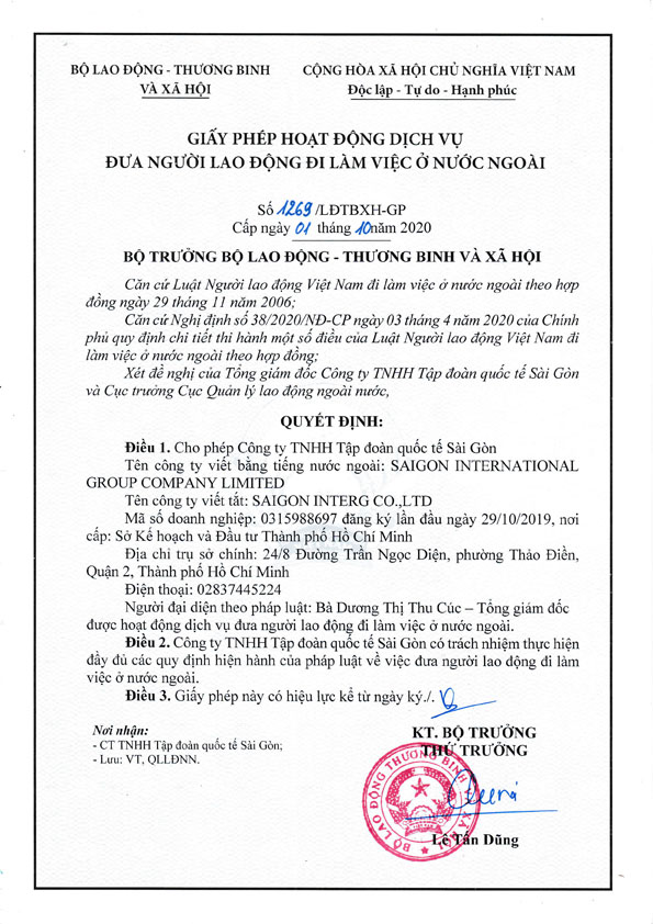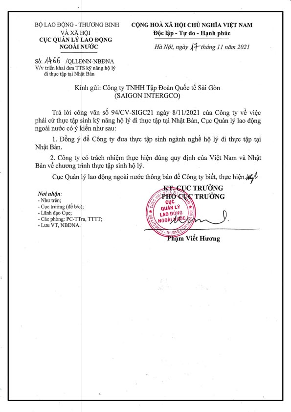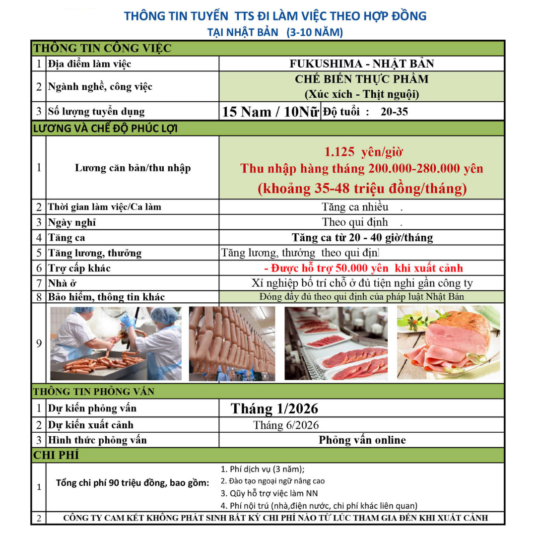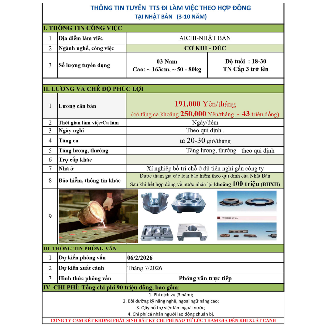 - Bước 6: Xuất cảnh sang Nhật Bản làm việc. Thực Tập Sinh sẽ nhận được sự hỗ trợ từ Nghiệp Đoàn và Nhân viên của chúng tôi tại Nhật Bản về các quyền lợi của người lao động theo Pháp Luật Nhật Bản.