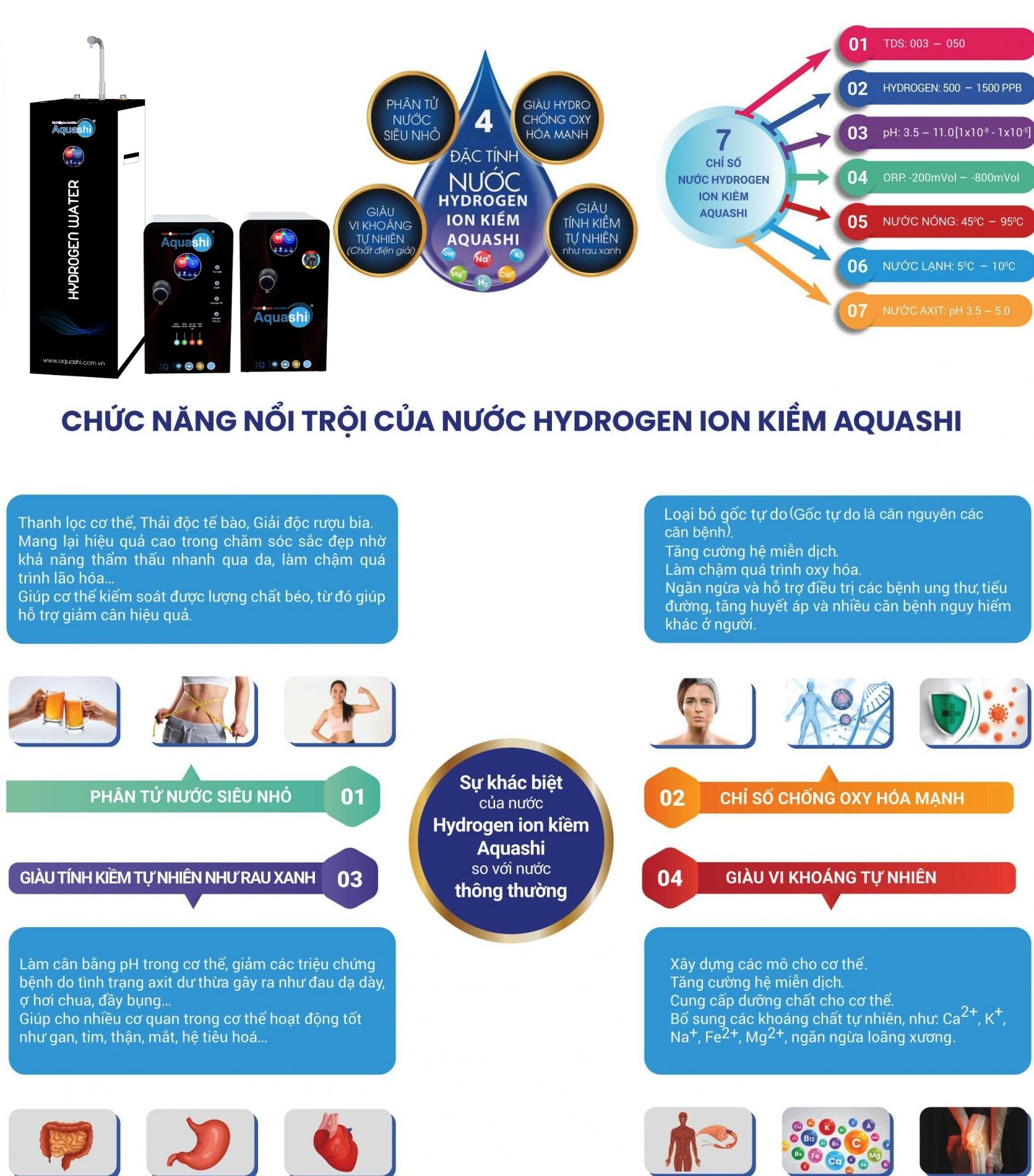 Nước Hydrogen ion kiềm Aquashi là nước có cụm phân tử siêu nhỏ, độ PH cao và chống oxy hóa mạnh, có khả năng ức chế các gốc tự do làm chậm trong quá trình lão hóa, tăng cường trao đổi chất, nâng cao hệ miễn dịch, đặc biệt hỗ trợ cho sự hoạt động của hệ tiêu hóa, ngăn ngừa các loại bệnh mãn tính trong đó có tiều đường, huyết áp, ung thư…